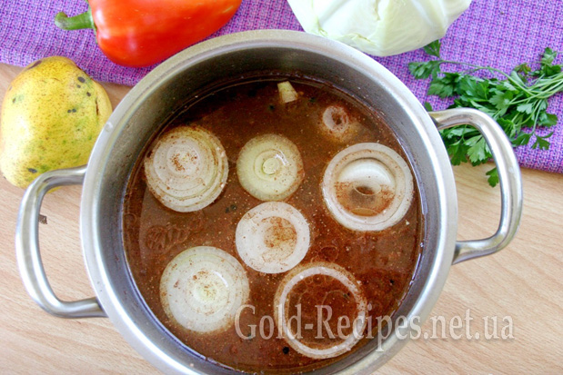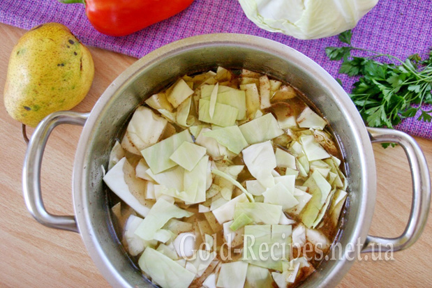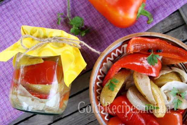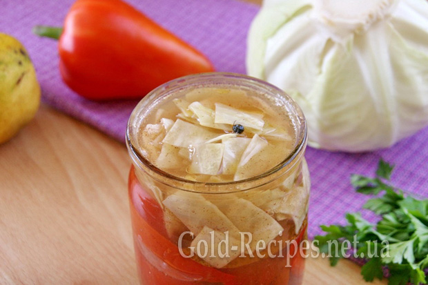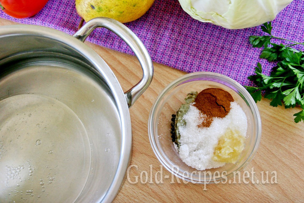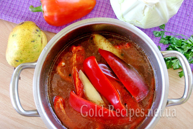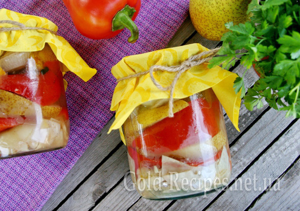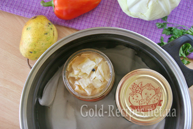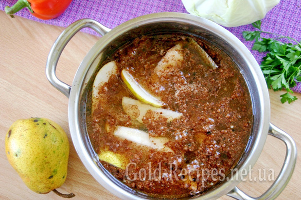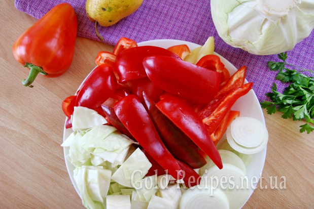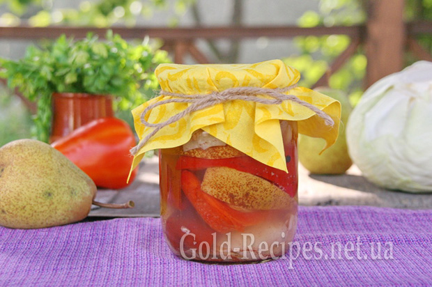 Інгредієнти закладаємо шарами: капуста, перець, груші, цибуля ріпчаста, перець, груші, цибуля і верхній шар – капуста.