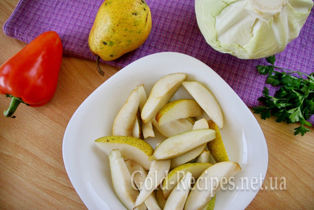 У груш видаляємо насіннєві коробочки і нарізаємо часточками – на 4-5 частин кожну половинку.