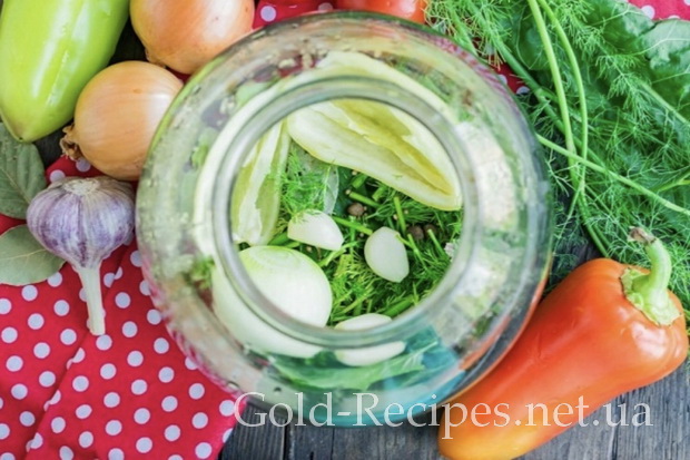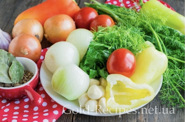 Потім поміщаємо в кожну банку 2 половинки болгарського перцю, 1 головку цибулі та 3 зубчики часнику.