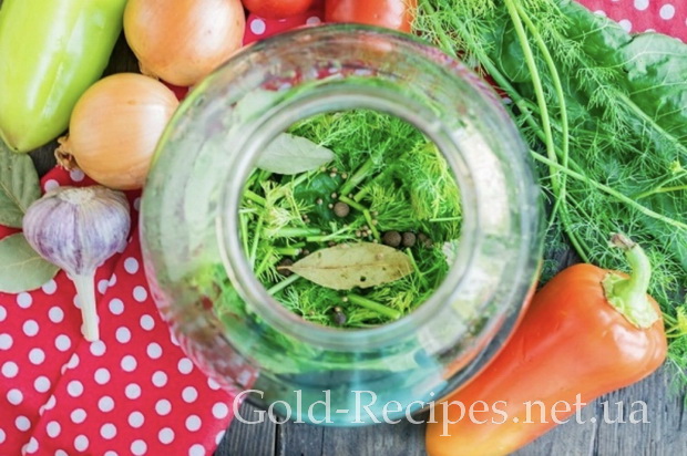 Додаємо кріп, листя хрону, лавровий лист, чорний запашний перець і насіння коріандру.