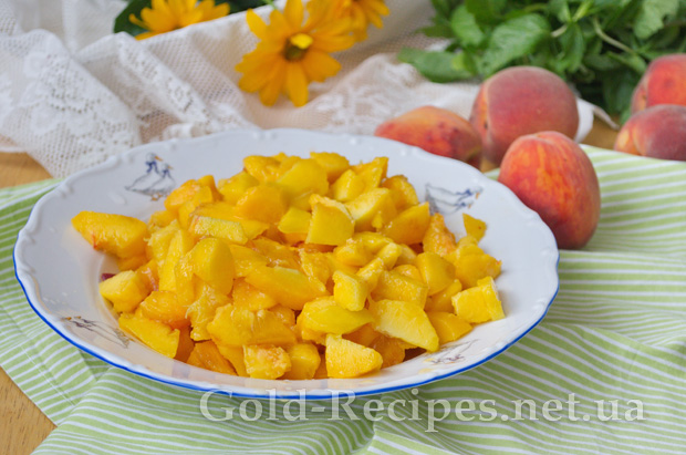 Персики миємо, видаляємо кісточку, чистимо від шкірки і нарізаємо невеликими шматочками, приблизно, як у мене на фото.