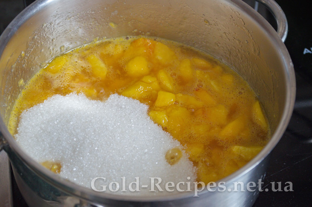 Підготовлені персики висипаємо в каструлю, і додаємо Желфікс і три столові ложки цукру. Перемішуємо, ставимо на плиту і доводимо до кипіння.