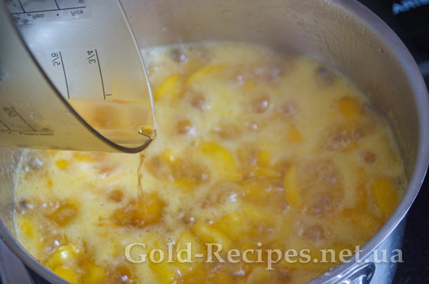 І додаємо в кипляче варення з персиків. Перемішуємо і проварюємо 3-5 хвилин з моменту закипання.