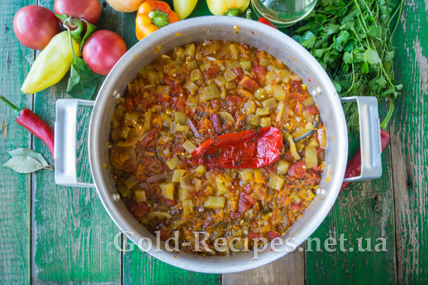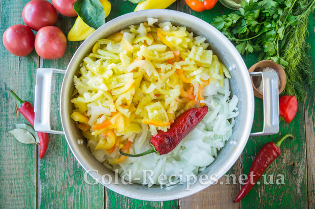 Потім висипаємо порізану ріпчасту цибулю, зверху додамо солодкий перець. Між шарами покладемо цілий стручок гострого червоного перцю. Завдяки йому десяточка з баклажанів на зиму вийде в міру гострою та пікантною.