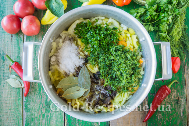 Потім висипаємо до овочів сіль і цукровий пісок. Додамо трохи гострого чорного перцю і листочки лаврушки для аромату. Петрушку і кріп дрібно нашаткуємо і теж відправляємо в салат.