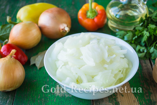 Ріпчасту білу цибулю почистимо, помиємо і поріжемо чверть кільцями приблизно такої ж довжини, що й солодкий перець.