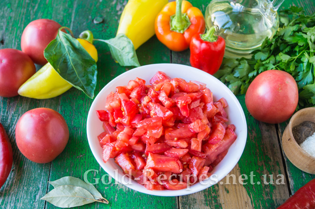 На помідорах зробимо хрестоподібний надріз і опустимо їх на хвилину в окріп. Акуратно знімемо з овочів шкірку. Поріжемо помідори кубиком середнього розміру. Томати зроблять салат десяточка на зиму особливо ароматним. Якщо у вас немає бажання возитися з бланшуванням і нарізанням томатів, можете просто натерти їх на тертці. Тут головне – позбутися шкірки.