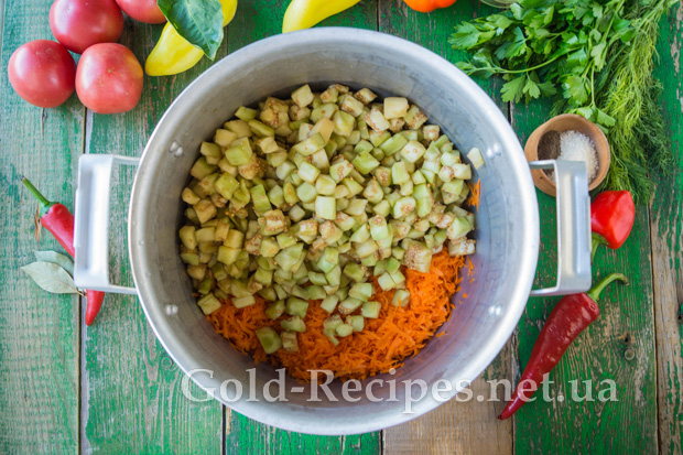 У велику глибоку каструлю шарами викладемо підготовлені овочі. Першим шаром викладемо терту моркву, поверх неї віджаті від води баклажани.