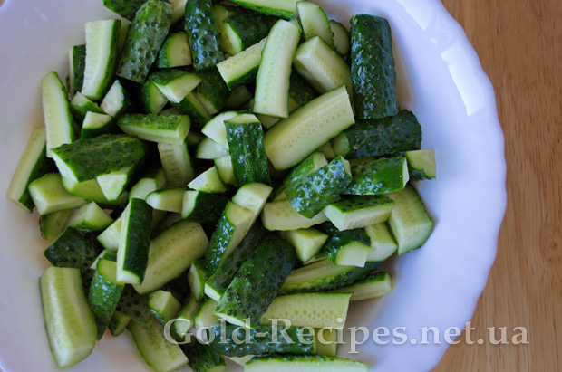 Нарізаємо огірки на 4 частини вздовж, а великі плоди ще навпіл. Має вийти як у мене на фото.