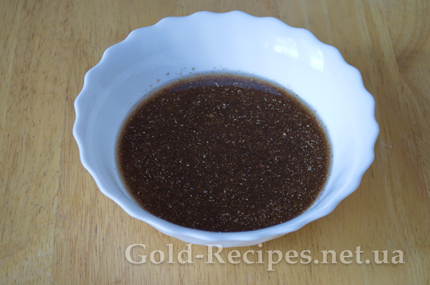 Готуємо маринад: олію змішати з цукром, оцтом, сіллю і спеціями. Часник почистити і подрібнити або пропустити через часничницю.