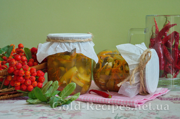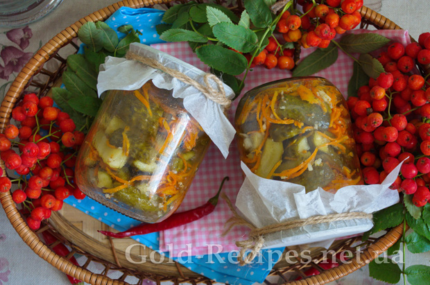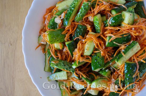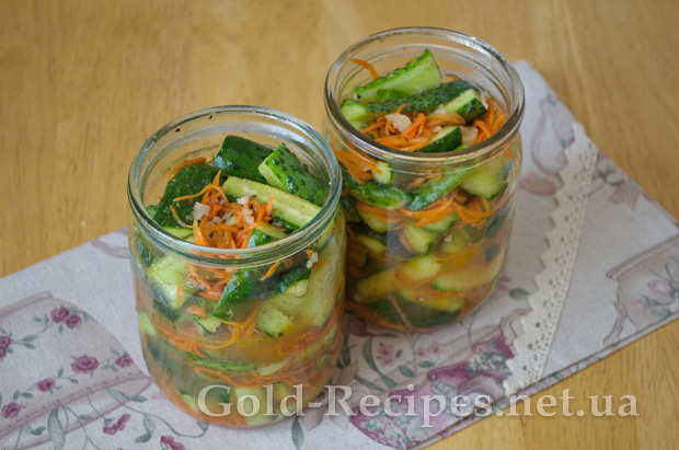 У великій просторій мисці змішуємо нарізані огірки, морквину, часник і заливаємо отриманим маринадом зі спеціями.