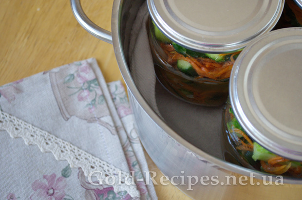 У простору каструлю стелимо тканинну серветку, викладаємо банки огірками, і наливаємо холодну воду до плічок банок.