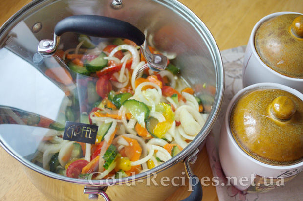 Перемішуємо салат, накриваємо кришкою і ставимо на плиту. Доводимо до кипіння, і варимо 10 хвилин, до зміни кольору огірків.