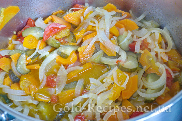 Усі підготовлені та нарізані овочі змішуємо у великій каструлі.