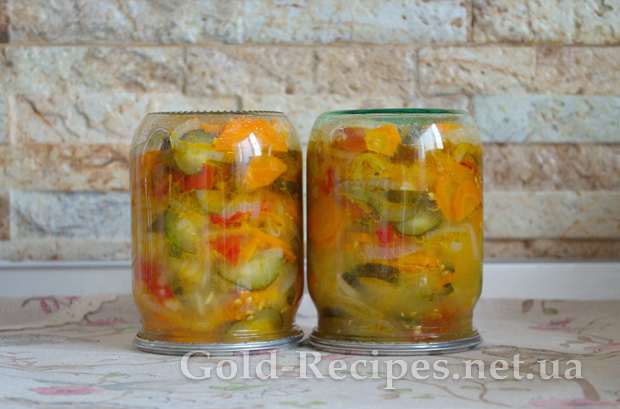 Банки з салатом закатуємо стерильними кришками, перевертаємо і вкутуємо в ковдру до повного охолодження.