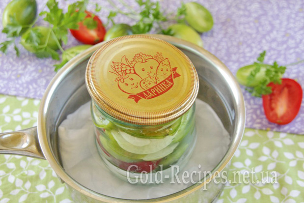 Прикриваємо банки прокип’яченими кришками і встановлюємо в каструлю, дно якої вистелене серветкою.