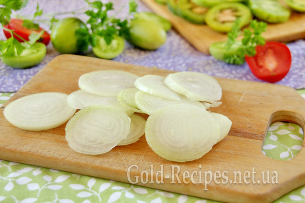 Помідори промиваємо проточною водою і нарізаємо кільцями завтовшки приблизно 0,5 см.