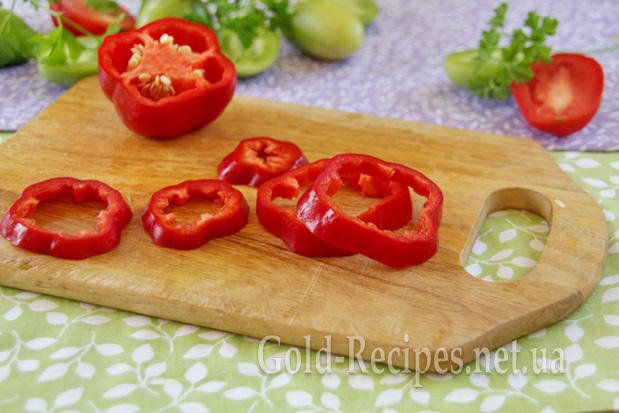 Болгарський перець промиваємо і нарізаємо тонкими кільцями. Видаляємо насіння та перегородки.