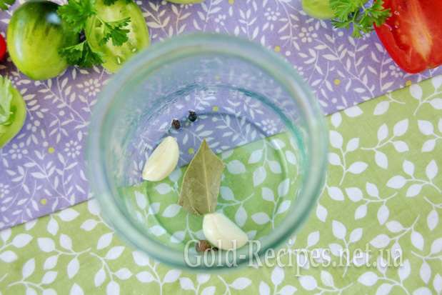 На дно заздалегідь простерилізованої банки кладемо лавровий лист, духмяний і чорний перець горошком, часник.
