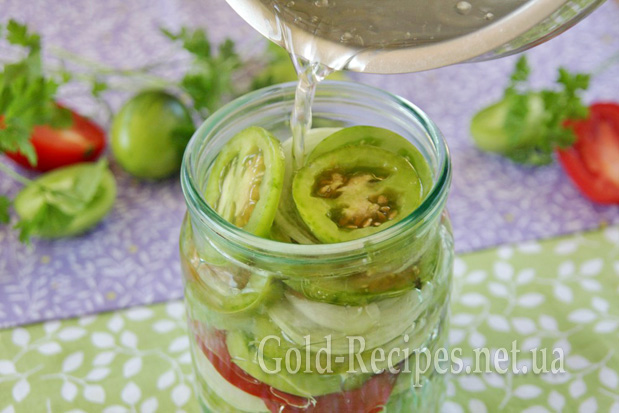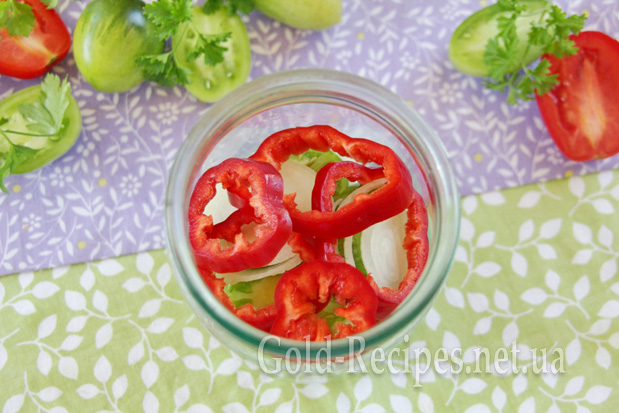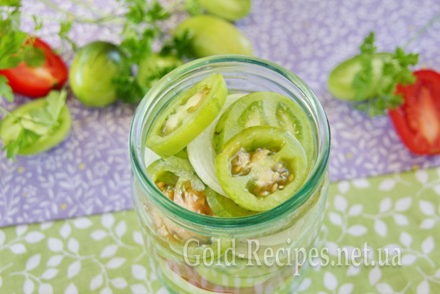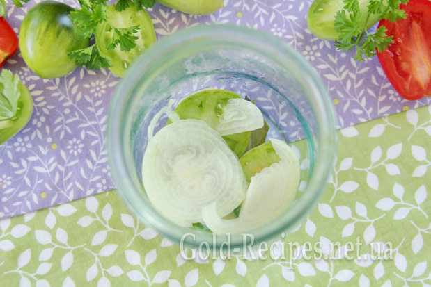 Потім викладаємо шар цибулі. Чергуємо солі помідор і цибулі, наповнюючи банку до половини.