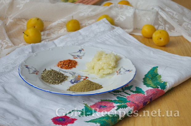 Тим часом підготуємо спеції, щоб наш соус до м яса з аличі вийшов ароматним і смачним. Часник чистимо і пропускаємо через прес.