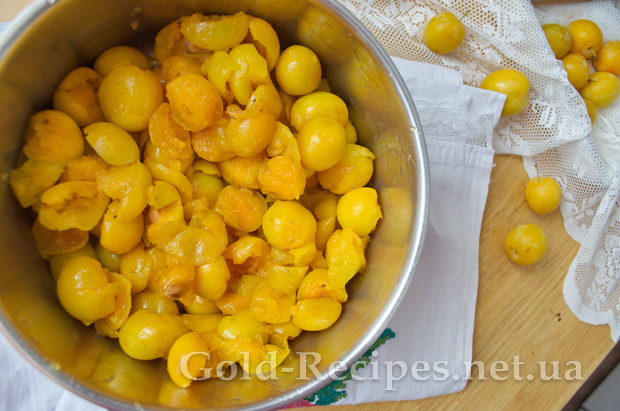 Можна надрізати кожну сливу ножем, а потім розчавити пальцями, або, якщо алича дуже стигла, розчавити товкачем для картоплі.