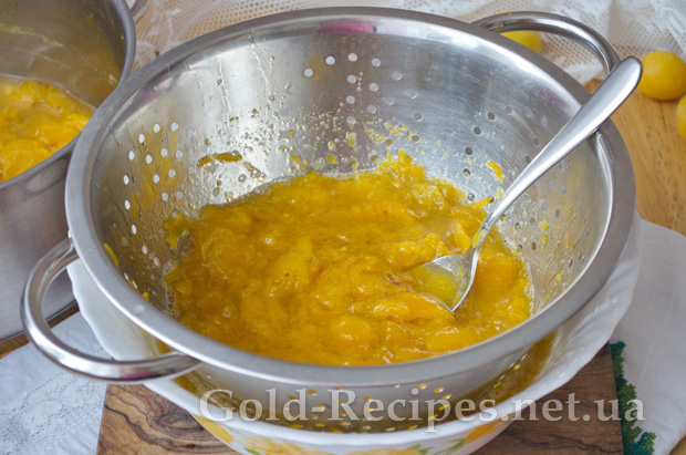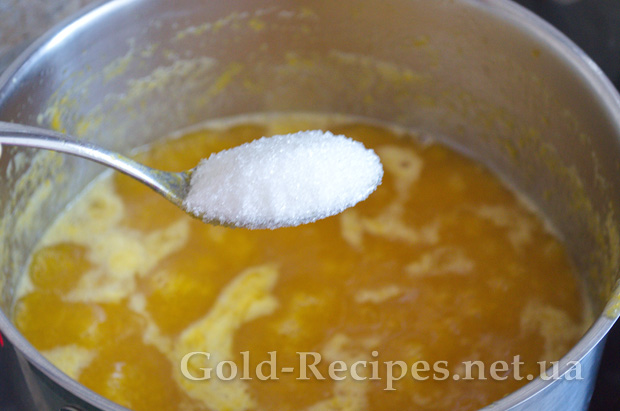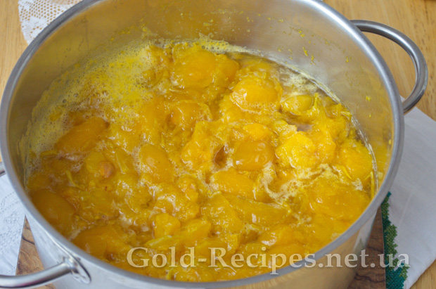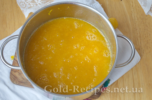 Отриману фруктову масу переливаємо назад у каструлю, ставимо на плиту, доводимо до кипіння і уварюємо 20 хвилин, щоб випарувалася зайва рідина.