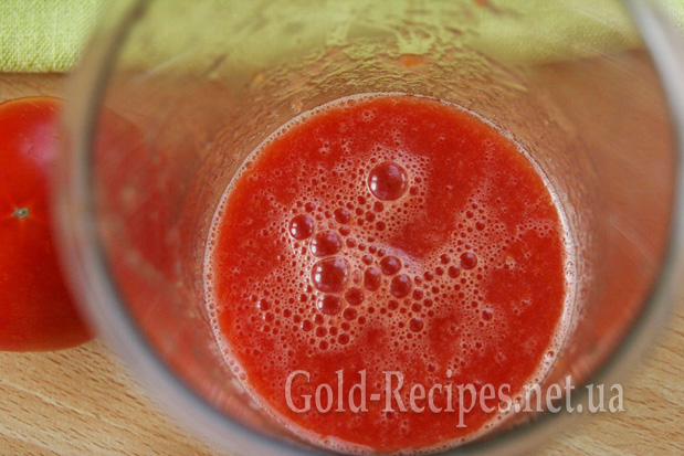 Розрізаємо помідори на невеликі шматки (щоб вони увійшли в отвір м’ясорубки). Перекручуємо помідори на м’ясорубці або подрібнюємо блендером.
