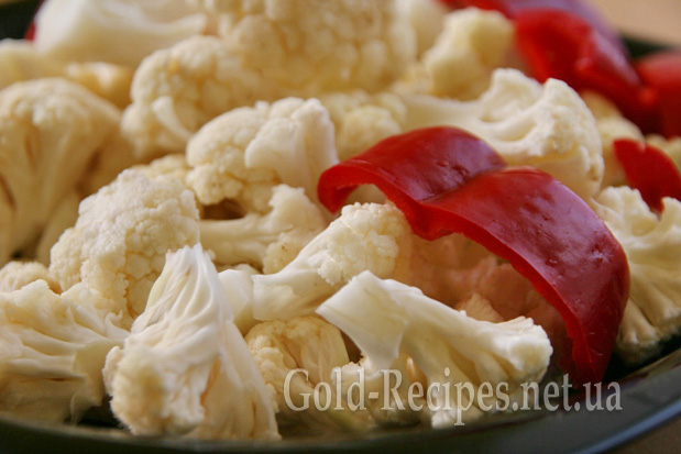 Нарізаємо перці великими часточками – кожну половинку на 3-4 частини. Капусту розбираємо на суцвіття.