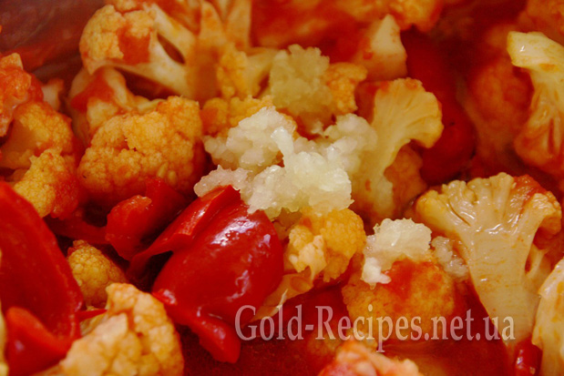 Усе перемішуємо і ставимо на вогонь. На середньому вогні доводимо масу до кипіння, кладемо цвітну капусту.