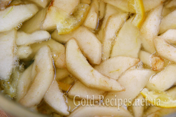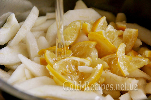 Порізані груші викладаємо в каструлю, додаємо до них кружки лимона. Порізані на 4 частини.