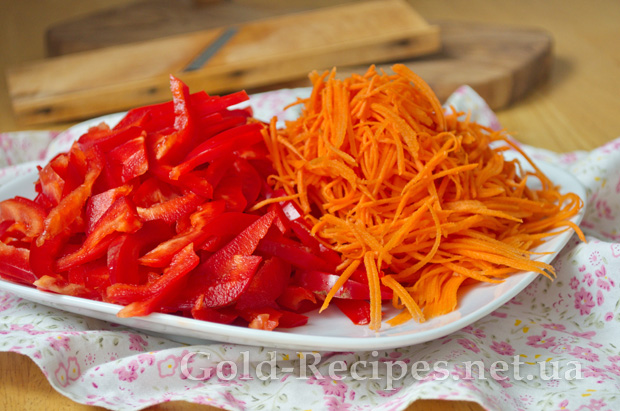 Морквину чистимо і натираємо на тертку для корейських салатів. Болгарський перець шаткуємо соломкою.