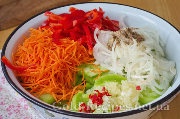 Змішуємо підготовлені зелені помідори з морквою, болгарським перцем, цибулею, часником, гострим перцем і спеціями.