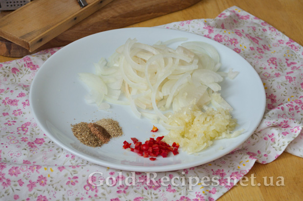 Цибулю нарізаємо тонкими півкільцями, часник пропускаємо через прес.