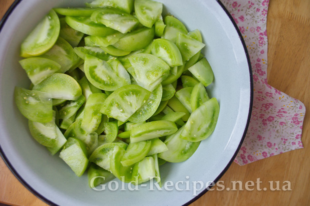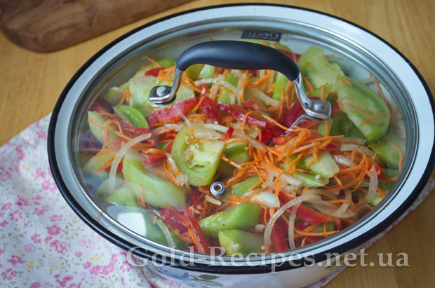 Знову перемішуємо наші зелені помідори, накриваємо миску кришкою і залишаємо маринуватися 30-40 хвилин.