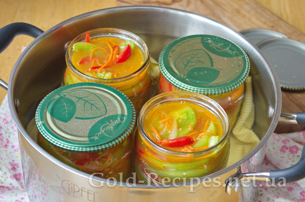 Далі зменшуємо вогонь до середнього, і витримуємо півлітрові баночки 15 хвилин, літрові – 20-25 хвилин.