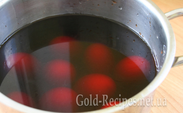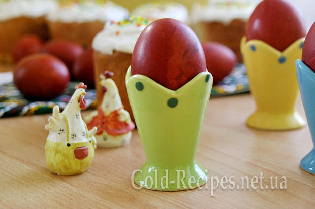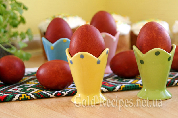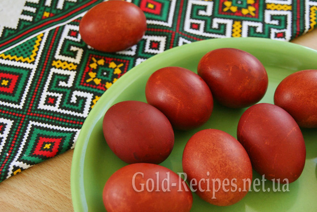 Цей спосіб – найнадійніший: яйця виходять гарного коричневого кольору, ніби оксамитові, а білок очищених яєць абсолютно білий, без будь-яких натяків на фарбу.