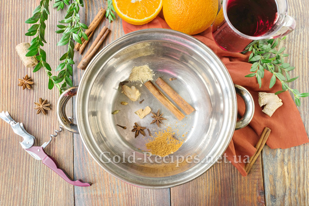 У каструлі або ковші відповідного розміру з’єднаємо всі спеції: палички кориці, зірочки анісу, бутончики гвоздики, корінь імбиру, мелений кардамон і мускатний горіх.