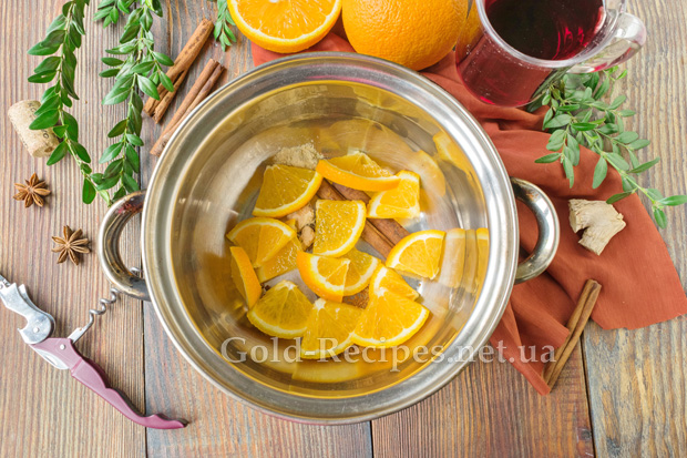 Апельсин помиємо і поріжемо на чверть кільця. Додамо порізані фрукти в каструлю до спецій.