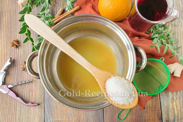 Додамо у відвар дві столові ложки цукру або меду, щоб глінтвейн вийшов ще смачнішим. Ретельно перемішаємо суміш, щоб цукор повністю розчинився.