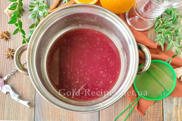 Тепер наллємо в пряний відвар напівсухе червоне вино. Перемішаємо інгредієнти та повернемо каструлю на вогонь.