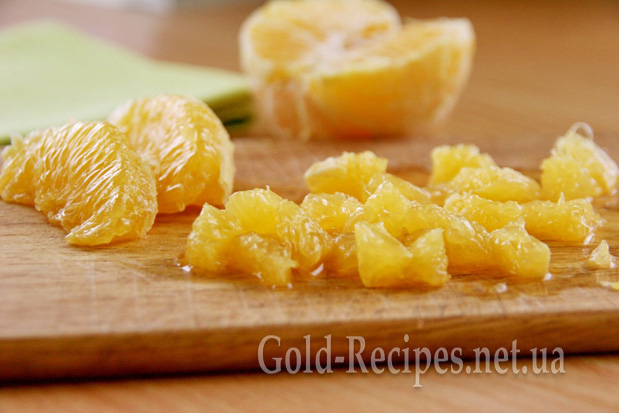Тому потурбуємося про смачну начинку для них – апельсин. Нам треба його почистити, видалити всі перегородки та нарізати на невеликі шматочки.