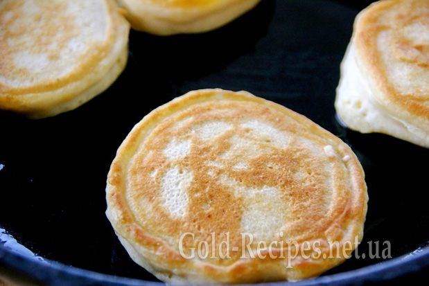 Потім перевертаємо на інший бік і знову чекаємо, поки оладки не стануть золотистими.
