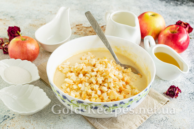 Яблуко миємо, очищаємо від шкірки, видаляємо серцевину з насінням. Нарізаємо фрукти дрібним кубиком, додаємо в тісто для оладок. За бажанням яблуко можна подрібнити на тертці з великим полотном.