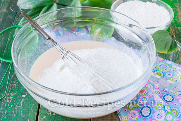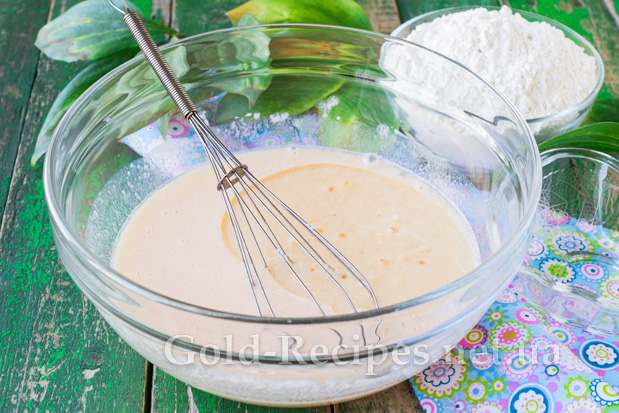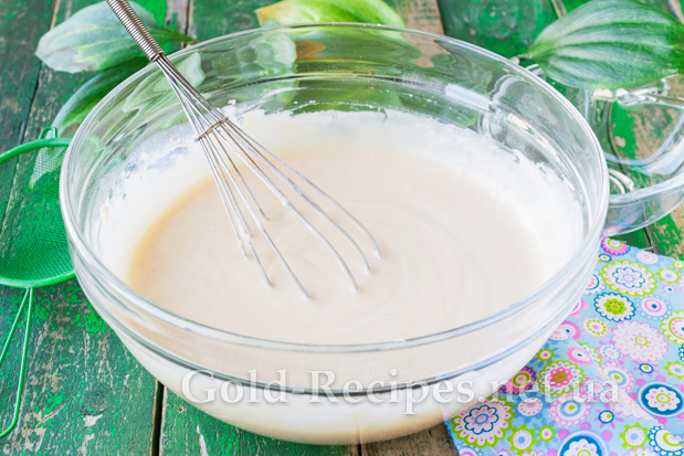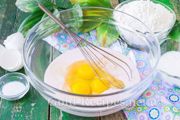 У глибокій піалі з’єднаємо фруктовий питний йогурт, соду і 3 курячих яйця. Ретельно перемішаємо суміш вінчиком, домагаючись однорідної консистенції.