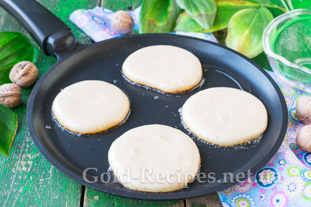 За допомогою столової ложки викладемо на розігріту сковорідку з рослинною олією готове тісто, формуючи круглі або овальні оладки.