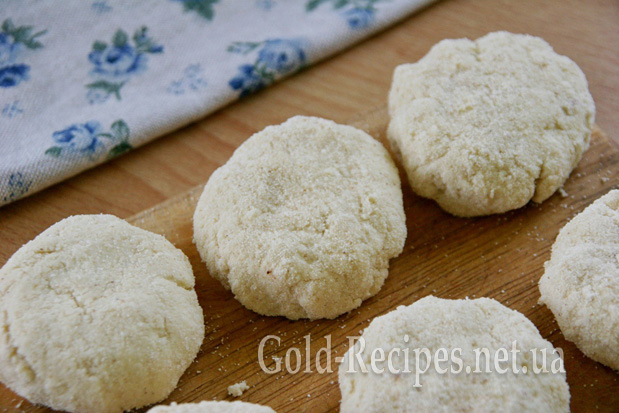 Пасту прикриваємо тістом, скріплюємо краї. Формуємо з тіста кульку і злегка приплющуємо її, залишаючи висоту близько 1,5 см. Сирник, що вийшов, обвалюємо в манній крупі.