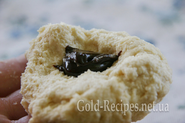 Формуємо сирники. Набираємо в руку приблизно пару столових ложок тіста, розхлюпуємо його в коло завтовшки близько 1 см. У центр кладемо приблизно 0,5 – 1 чайну ложку шоколадної пасти.