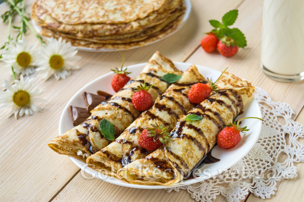 У готові млинці можна загорнути улюблену начинку. Солодкі млинці будемо подавати з рідким медом, варенням, шоколадним топінгом, солоні – зі сметаною.