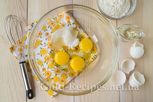 У посуд із високими бортиками вб’ємо три яйця. Додамо дрібну сіль, цукровий пісок і харчову соду.